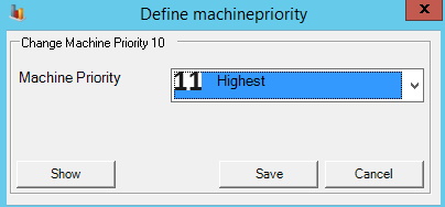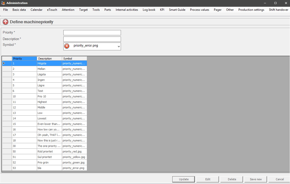 This is where machine priority is administered. Via "Client" -> "Administration" -> "System settings" -> "Basic data" -> "Users" you can choose if a specific user should be able to disable/show/change machine priorities in the menu called "Machine priority". This is found in the first tab for users. A column for machine priority is visible in the Overview of the Client. If you click there a new drop-down list with a list of options will appear. Please note that it is up to each customer to define what each level/symbol of the machine priority actually means. If any more symbols are needed, please contact Delacroys support for further assistance.
