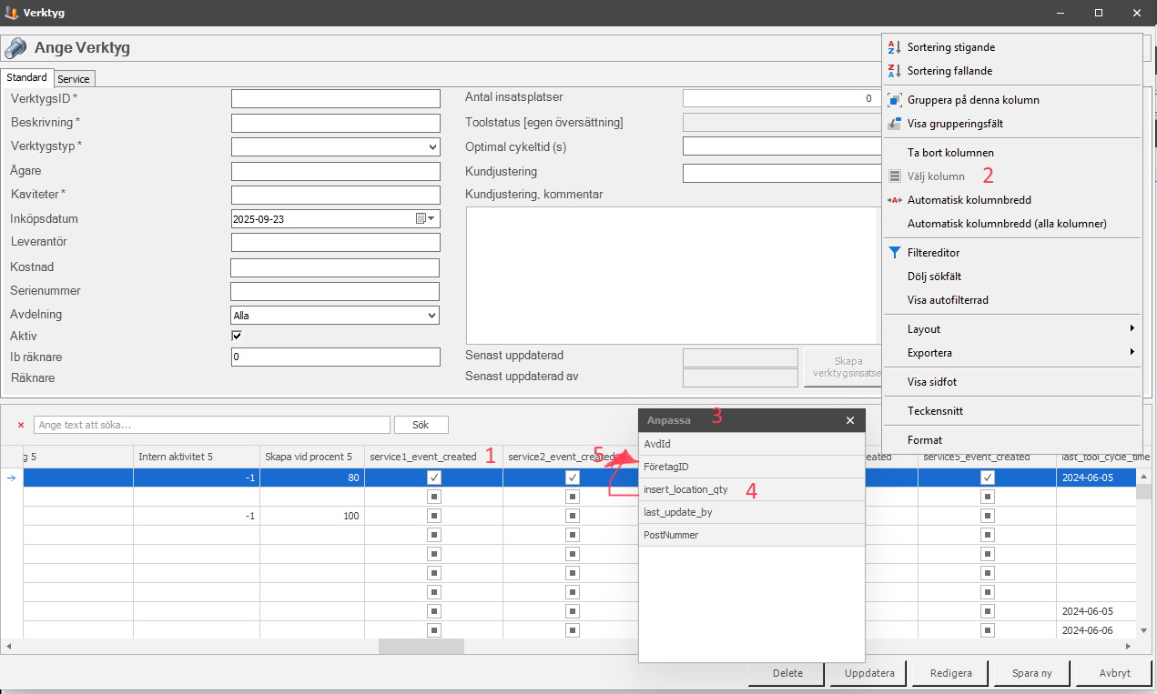 Formuläret för "Verktyg" stödjer Balthzars nya grid-system. För att använda det får man högerklicka på ett kolumnhuvud, se 1 i bilden ovan. I den nya menyn som visas får man välja alternativet "Välj kolumn", se 2. När det är gjort kommer en ny meny upp som heter "Anpassa", se 3. Det är därifrån man kan välja att lägga till, eller ta bort olika kolumner som ska visas. Vill man t.ex. visa antalet insatser i ett verktyg i listform. Då väljs insert_location_qty, se 4. Sedan dra det alternativet tillbaka till tabellen, se 5. Då kommer sedan antal insatser att visas i listform.